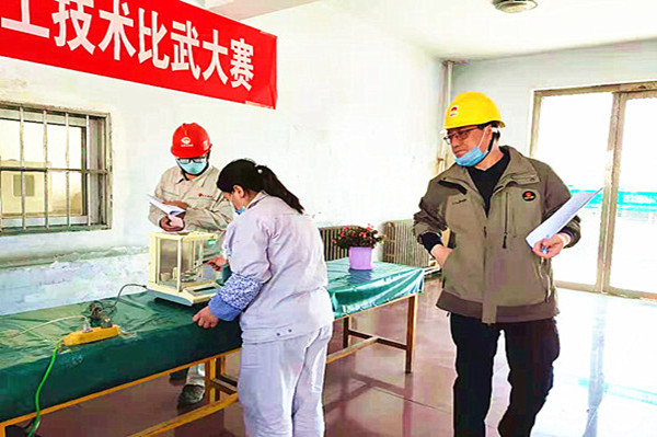 比賽現(xiàn)場女職工熟練的操作技能,沉著冷靜,對電石破碎樣品進(jìn)行計(jì)量稱重;對工作一絲不茍,嚴(yán)格把控電石發(fā)氣量。