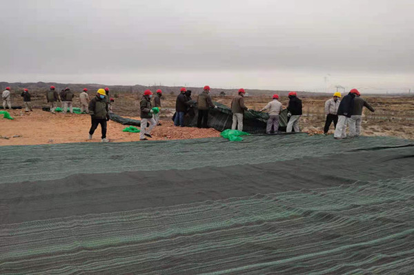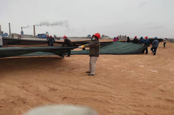 由于公司電石泥堆場地更換為新原料堆場造成的部分土地裸露,造成揚塵污染,治風沙、阻揚塵這項工作迫在眉睫;初冬的天氣冷風呼啦啦掃動著滿地的枯葉紙屑,濃黑的云像一團團破絮,倒懸在我們的上空,北風呼呼那個吹,任憑它的怎么肆虐卻擊退不了職工們工作的熱情,瞧他們單膝蓋在潮濕的泥土上細心的用鐵絲鏈接著每個接口。男職工展現(xiàn)大力水手的魅力,兩人一卷,一人一卷有序的擺放在裸露的土地中央,女同事也不甘示弱拆開整卷防塵網(wǎng)整齊的鋪在砂石頂部,大家喊著整齊的口號,經(jīng)過一早上不懈努力,就將整個原料場地覆蓋完畢。既抑制滿天風沙的場景,也保存了大量的原料被風帶走,造成原料損耗。