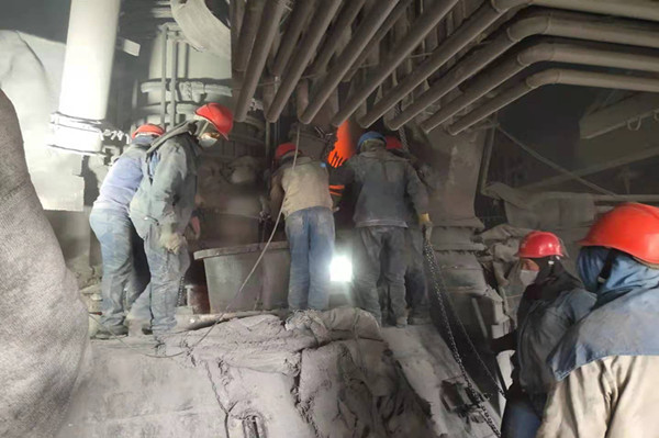 剛踏上平臺(tái),首先映入筆者眼簾的,是一群穿著藍(lán)色牛仔工裝的工友們正在有序的拆卸二層爐面保溫材料準(zhǔn)備更換燒損下料柱。只見他們個(gè)個(gè)干勁十足、衣服早已被汗水浸濕、黑乎乎的臉看不清誰是誰?他們顧不得爐面余溫的熾熱、爐面積灰的刺鼻積極投入到檢修中,一時(shí)間吶喊聲、叉車鳴笛聲,起重吊車的口哨聲,聲聲作響,猶如一首交響樂響徹整個(gè)檢修現(xiàn)場!在大家的齊心協(xié)力下,燒損下料柱順利被拆下,并按時(shí)裝好!